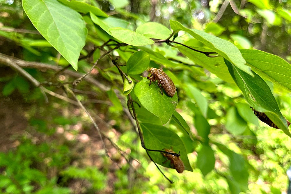 Before they can sing, periodical cicada nymphs molt and leave behind exoskeletons like these. The U.S. Forest Service projected that trillions of cicadas would emerge this year across the Midwestern and Southeastern U.S. Photo credit: Zach Dyer/KFF Health News.