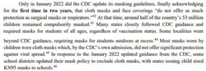 The report details the CDC’s mask flip-flopping through the years. It’s especially infuriating to recall the CDC’s weird, anti-scientific, anti-human focus on masking toddlers with cloth masks into 2022.