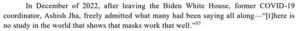President Biden’s COVID-19 advisor Ashish K. Jha waited until December 2022 (right after leaving government service) to tell the country that “[t]here is no study in the world that shows that masks work that well.” What took him so long?