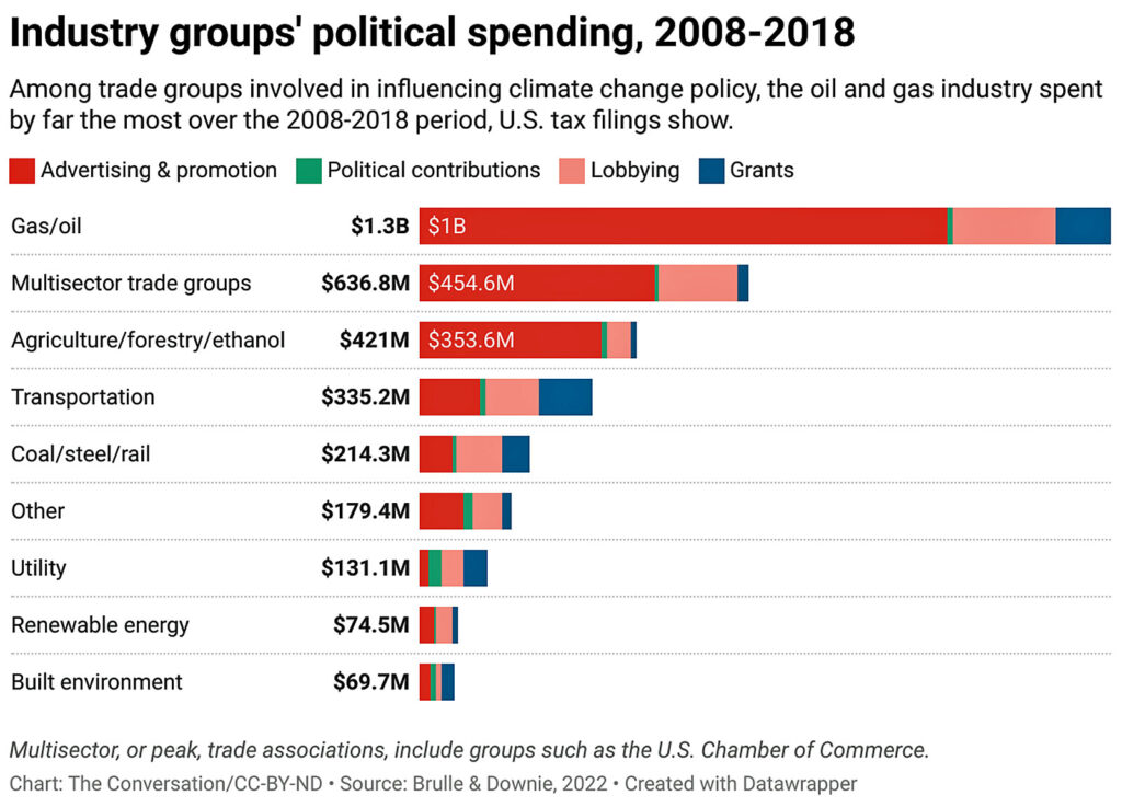 We found that trade associations historically opposed to climate policies spent $2 billion in the decade from 2008 to 2018 on political activities, such as advertising, lobbying and political contributions. Together, they outspent climate-supporting industry groups 27 to 1.