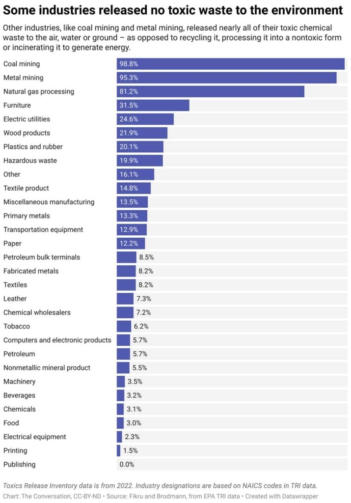 But facilities in different industries have different release rates. For example, about 99% of toxic chemicals from coal mines are released to the environment, compared with 81% for natural gas extraction, recovery and processing; 25% for power-generating electric utilities; and less than 3% for electrical equipment manufacturers.