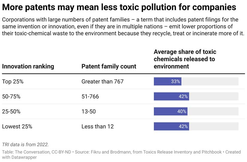 One corporate attribute we examined was innovation, which we measured by counting corporations’ patent families, which are groups of patent documents related to the same invention, even if they are filed in different countries. We found that companies with more patent families tend to release less of their toxic waste to the environment.