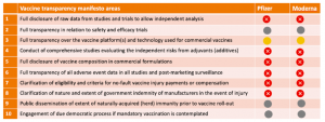 Table. État actuel de la transparence sur les vaccins BioNTech/Pfizer et Moderna à ARNm. Le 19 novembre 2020