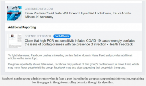 El artículo que observé que Facebook marcaba como “falso” se titula “Las pruebas falsas positivas de Covid extenderán los confinamientos injustificados, Fauci admite la ‘precisión minúscula’ “, escrito por el reportero de The Highwire, Jefferey Jaxen. (El vínculo en este caso era para el artículo en GreenMedInfo, donde se volvió a publicar desde el sitio web de The Highwire.)