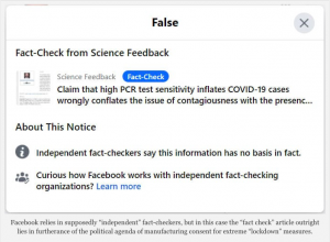 Esa es la verdad que Facebook y su socio de “verificación de datos”, Health Feedback, ahora están tratando de ocultar al público censurando artículos que señalan el problema, mientras que miente rotundamente al decir que una prueba positiva de PCR necesariamente es igual a un “caso COVID-19”.