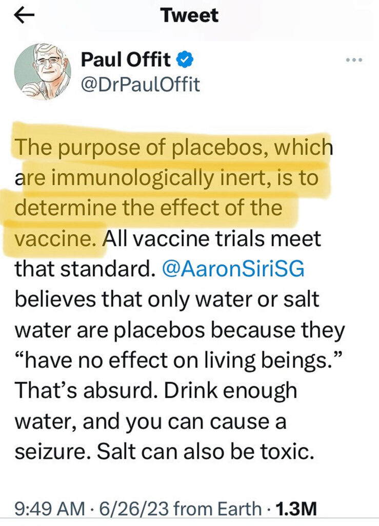 Desglosemos el ataque de Offit a Siri. Offit afirma: “El propósito de los placebos, que son inmunológicamente inertes, es determinar el efecto de la vacuna”.