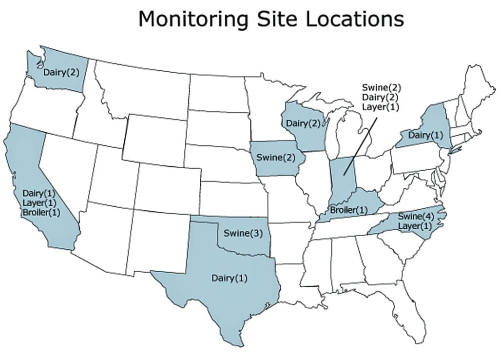 Heber’s team monitored emissions at 27 sites on 25 CAFOs in 10 states. (At two of the CAFOs, teams monitored multiple emissions sites.) The team monitored each site continuously for two years.