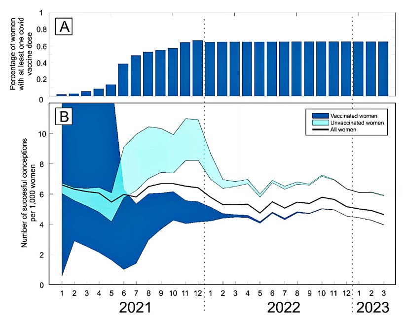 1. Vaccinated women conceived about a third fewer children than would be expected from their share of the population. Unvaccinated women conceived at about the same rate as all women before the pandemic. Thus, a strong association between COVID-19 vaccination status and successful conceptions has been established.