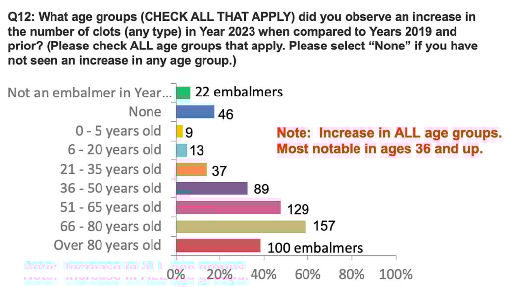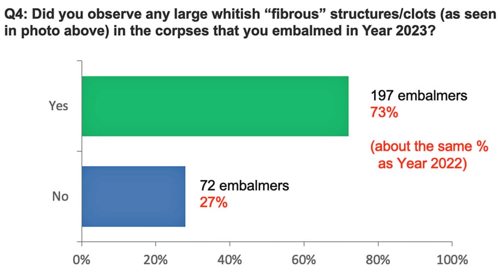 En una encuesta reciente realizada a 269 embalsamadores de cuatro grandes países y tres continentes, más del 70% declararon haber encontrado extraños coágulos blancos fibrosos en porcentajes significativos de cadáveres en 2023, coágulos que no encontraban antes de la pandemia.