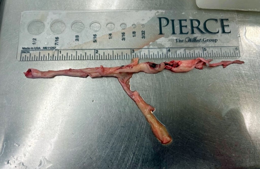 Hirschman dijo que ha visto un coágulo fibroso que se extrajo de una persona viva, pero que también ha visto la formación adicional de material de la sangre en un tubo de ECMO (una máquina que oxigena la sangre fuera del cuerpo) post-mortem. El cuerpo que estaba preparando tenía un coágulo a lo largo de la pierna.