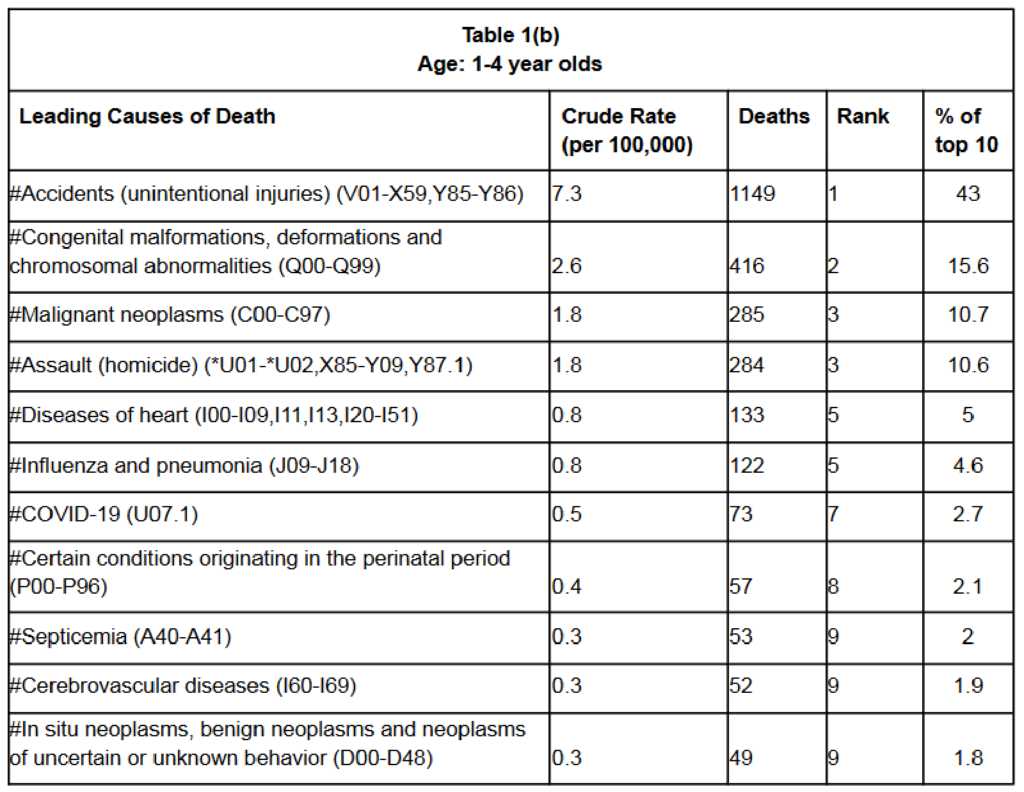 El COVID-19 aparece como la séptima causa de muerte en niños de 1 a 4 años, sin embargo, sólo comprende el 2,7% del total de muertes. Para ponerlo en perspectiva, las seis causas más frecuentes suman el 89,5%.