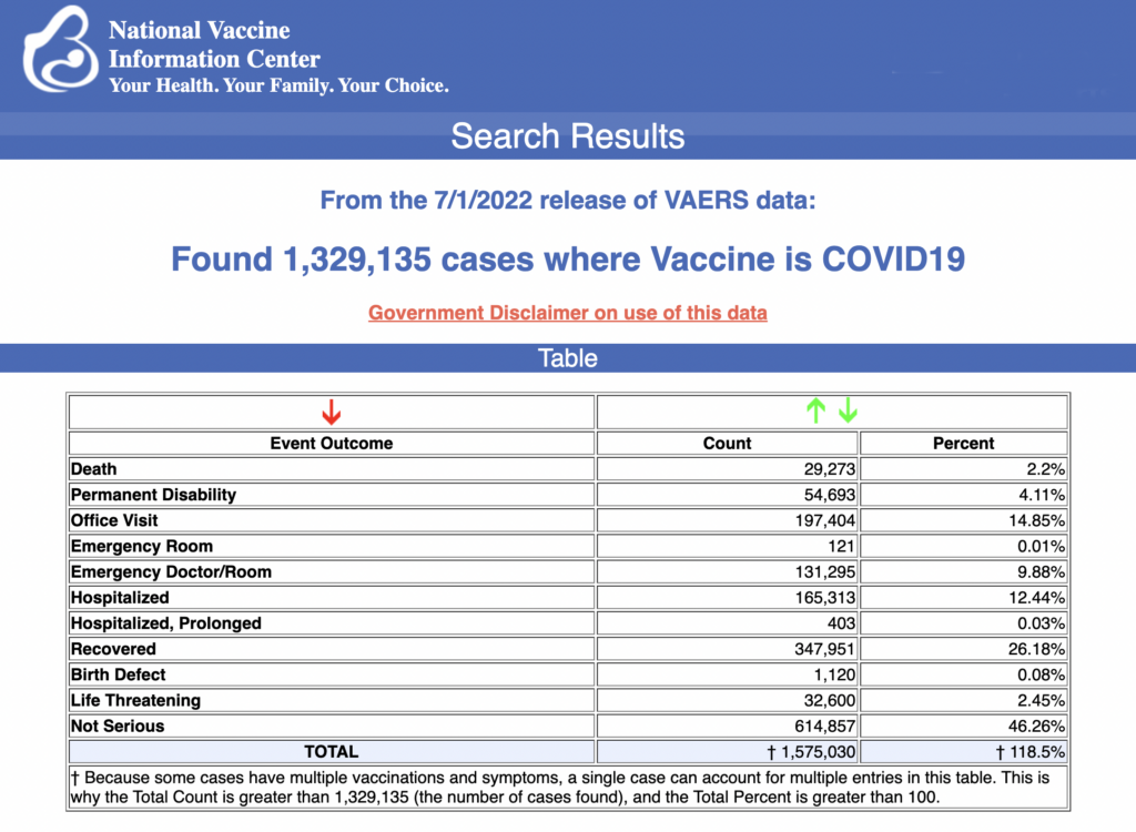 Escludendo le “segnalazioni da fonti estere” inviate al VAERS, durante il periodo tra il 14 dicembre 2020 e il 1° luglio 2022 sono stati segnalati, negli Stati Uniti, 839.450 eventi avversi tra cui 13.547 decessi e 85.321 gravi danni subiti.