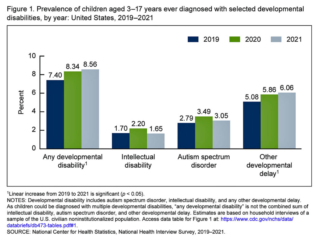 More broadly, the report reveals that nearly 1 in 10 children in the U.S. were diagnosed with a developmental disability in 2021, an increase from previous years.