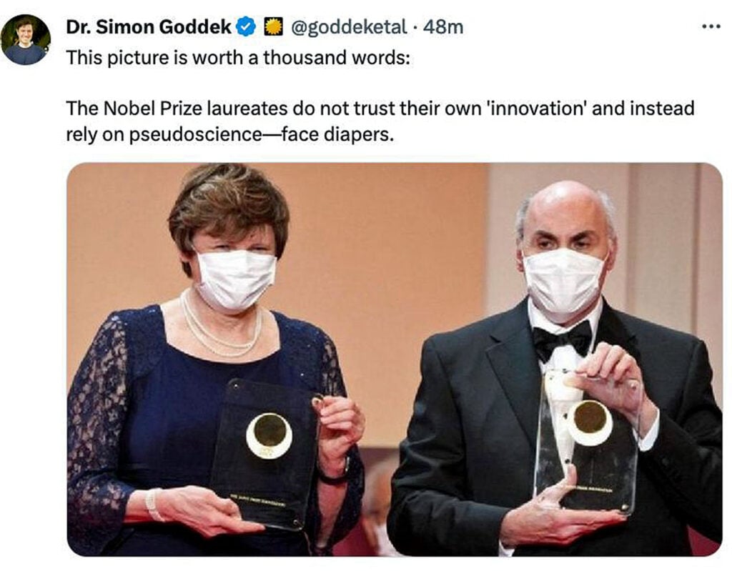 Pero Kämpe, en lo que Eugyppius calificó de “reconocimiento encubierto“, dio la puntilla al decir que esperaba que el premio “hiciera que la gente indecisa aceptara la vacuna y estuviera segura de que es muy eficaz y segura”.