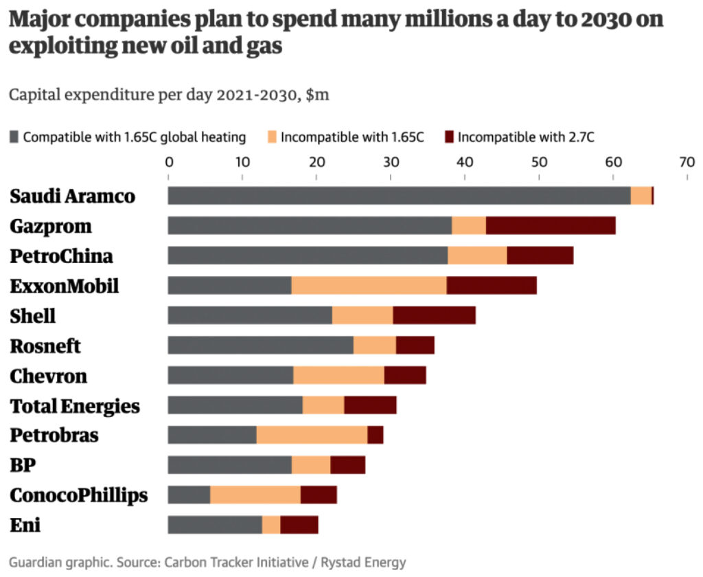 Les bombes à carbone des grands groupes pétroliers risquent de mettre en péril les derniers espoirs de limiter le réchauffement planétaire à 1,5 °C au-dessus des niveaux préindustriels d’ici 2100, objectif de l’accord de Paris sur le climat.