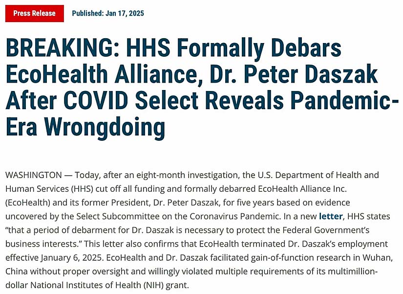 In January 2025 — during the transition period before the new administration took office — EcoHealth Alliance abruptly fired Daszak as its president, bowing to pressure and hoping to save the organization.