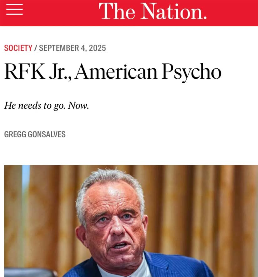 Another tactic: emotional and moral framing. The coalition has framed RFK Jr. not just as wrong, but as an urgent moral threat, dovetailing with media allies in this operation who, like the Nation, have gone so far as to characterize him as the “American Psycho.”