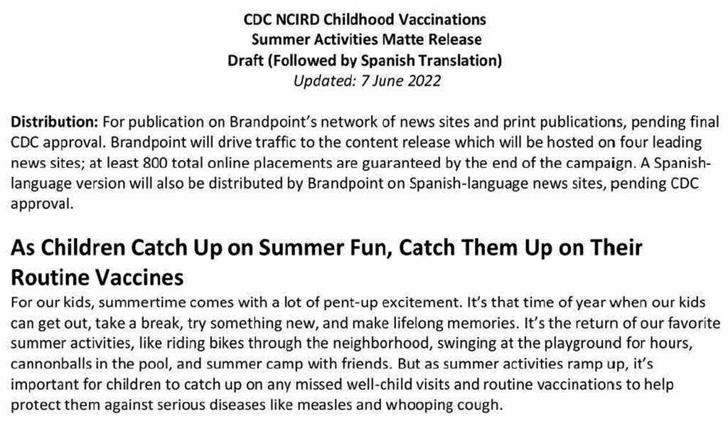 El contrato solicitado por la FOIA especifica que la agencia de publicidad desarrollará una amplia variedad de estrategias de medios de comunicación para transmitir el mensaje de los CDC/NCIRD sobre las vacunas contra la gripe, aunque no siempre en su nombre, incluida la redacción de artículos sin marca para su distribución en los medios de comunicación, formación de portavoces, difusión entre famosos, bombardeos en las redes sociales, escucha y seguimiento de las redes sociales, podcasting y mucho más.