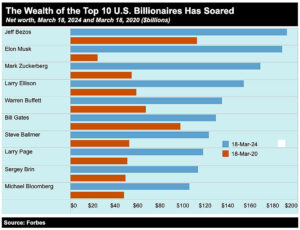 A 18 de marzo de 2024, la riqueza total de los multimillonarios estadounidenses aumentó un 87,6% desde el inicio de la pandemia, alcanzando los 5,53 billones de dólares.