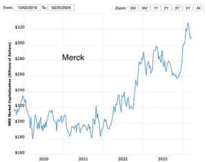Los siguientes gráficos muestran la evolución de la capitalización bursátil de algunas empresas farmacéuticas y tecnológicas (todos los gráficos proceden de Macrotrends).