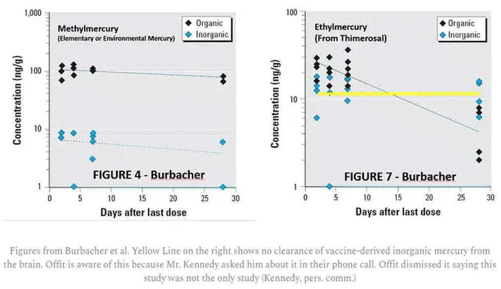 Also, there’s a history related to the likely accumulation of inorganic mercury from thimerosal in the brain: It’s the point that Kennedy raised with Offit during their conversation that Offit could not address. And it’s an important point that Offit failed to answer in his recent letter.