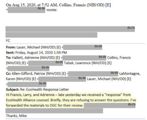 Un correo electrónico de Lauer de agosto de 2020 señalaba que ‘EcoHealth’ se negó a responder a las preguntas que exigía el NIH.