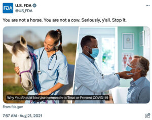 La FDA también eliminará las publicaciones en redes sociales de Twitter, LinkedIn, Facebook e Instagram publicadas en 2021 y 2022 con mensajes como “No eres un caballo. No eres una vaca. En serio. Basta ya”.