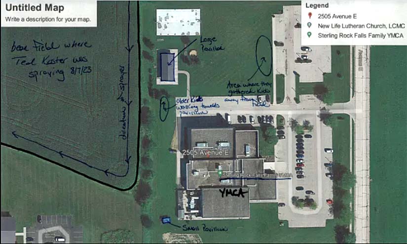 This IDOA map shows the field where Ted Koster was spraying pesticides on his field in close proximity to the YMCA building in Sterling, Illinois, on Aug. 7, 2023, according to IDOA pesticide misuse investigative documents. An arrow points from an area near the field towards the large pavilion, showing where the children were when they saw the applicator. According to documents, YMCA staff members “moved all the kids to the field towards the parking lot away from the field as fast as they could. They stated within ten minutes they had all the kids back inside the YMCA building.” Source: IDOA v. Koster, pesticide misuse investigation.