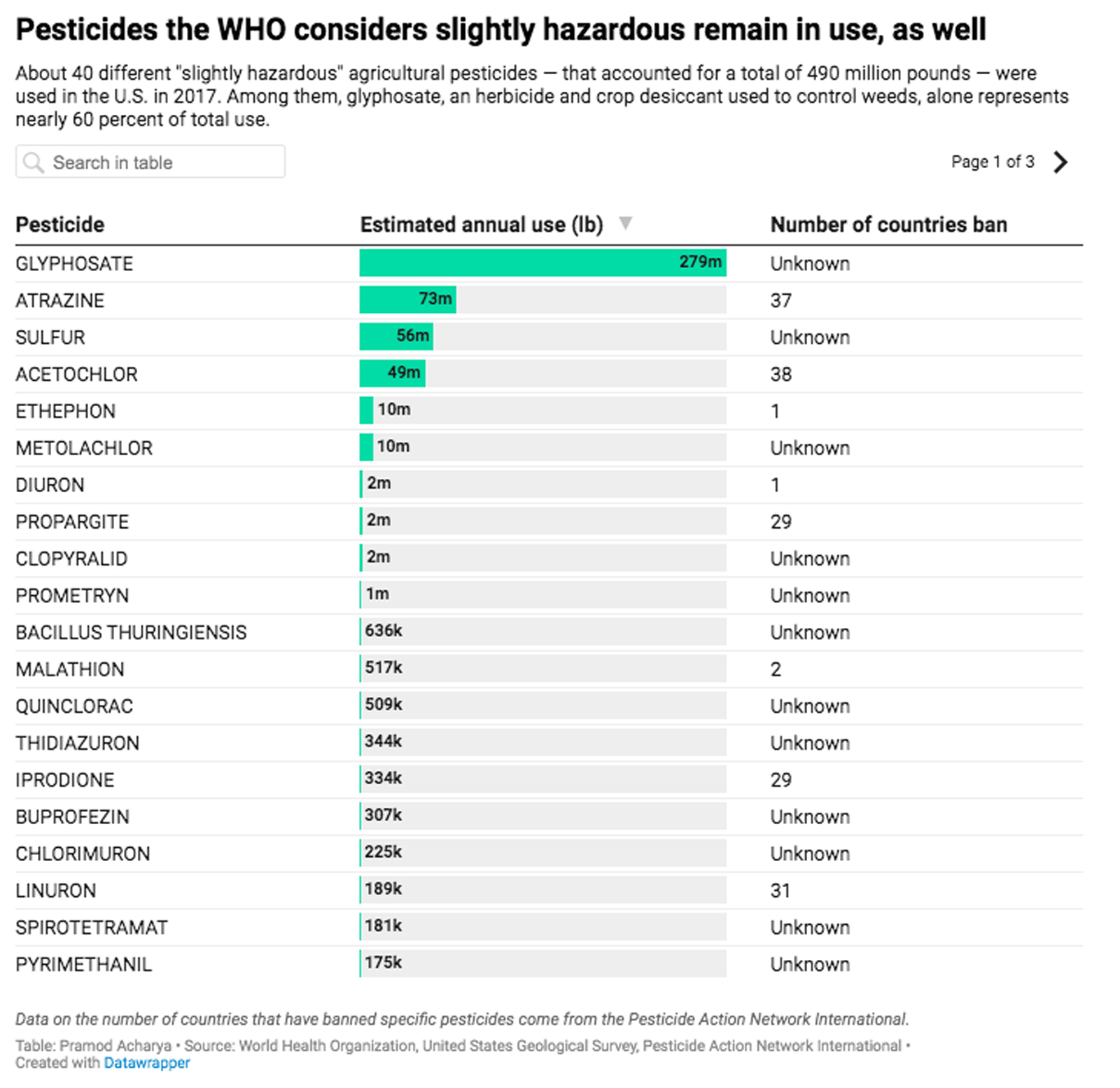 About 3 million pounds of agricultural pesticides that the World Health Organization considers “extremely” or “highly hazardous” were used in the U.S. in 2017, according to the U.S. Geological Survey (USGS).