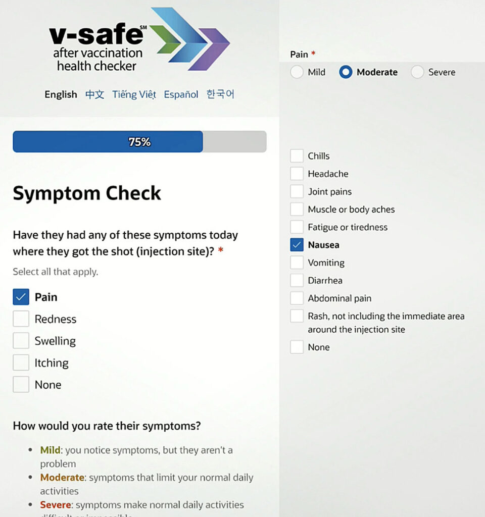 El sistema V-safe se diseñó para recoger los datos de las encuestas realizadas a los vacunados diariamente durante los siete primeros días, semanalmente durante las cinco semanas siguientes y a intervalos de tres, seis y doce meses.