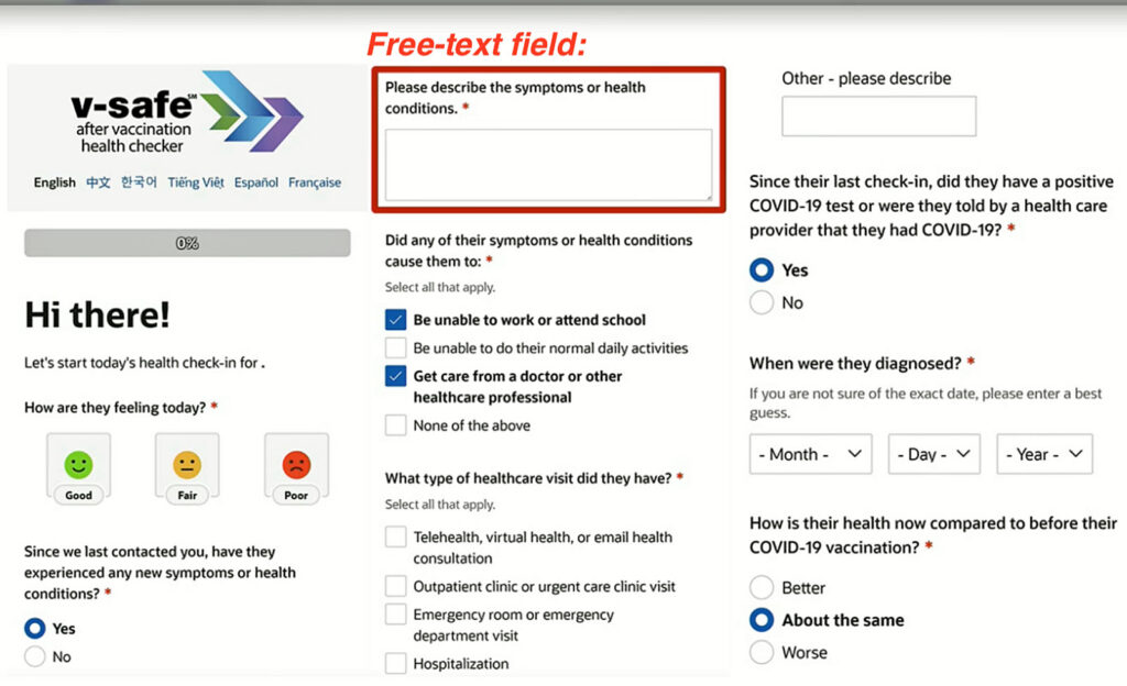 Demandas anteriores obligaron a los CDC a publicar resúmenes superficiales de síntomas comunes generados por el sistema V-safe. Sin embargo, los campos de texto libre que los CDC están ahora obligados a publicar representan el único canal para notificar afecciones graves como miocarditis, coágulos sanguíneos o accidentes cerebrovasculares.