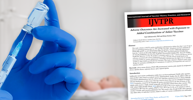 Washington, D.C. — In the research article, “Adverse Outcomes Are Increased with Exposure to Added Combinations of Infant Vaccines,” published yesterday in the International Journal of Vaccine Theory, Practice, and Research, Children’s Health Defense (CHD) scientists reveal the sheer number of vaccine-induced diseases in infants and children increases exponentially, more than doubling, with every added vaccine.